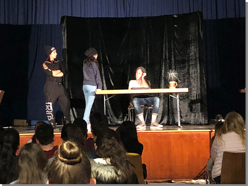 Die Zuschauer, das waren unsere drei siebten Klassen. Für die fast 90 SchülerInnen unserer Schule wurde das Stück in der extra angemieteten Halle des TV-Stammheim exklusiv aufgeführt. Doch nach dem Stück war vor dem Stück! So hatten die SchülerInnen nach einem Gespräch mit den SchauspielerInnen, bei dem es um unterschiedliche Bewältigungsstrategien für Frustsituationen ging, die Möglichkeit selbst ins Geschehen des Stückes einzugreifen. Die SchülerInnen konnten das Stück hierfür an einzelne Schlüsselstellen "zurückspulen" und die Rolle einer Person übernehmen. Während die SchülerInnen alternativ aufzeigten, wie sie sich in der Situation verhalten hätten, reagierten die SchauspielerInnen ebenfalls spontan und veränderten dabei das Stück, um den SchülerInnen so die Reaktionen auf ihr Handeln zu verdeutlichen. Sowohl für die spielenden, als auch für die zuschauenden SchülerInnen eine besondere Erfahrung.
