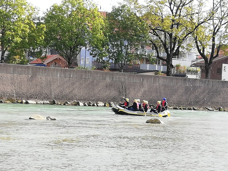 Am vierten Tag stand Sport auf dem Plan. Nach dem Frühstück um 7.30 Uhr hatten wir noch ein wenig Zeit, bis wir uns um 8.30 Uhr vor der Abfahrt trafen. Zusammen liefen wir dann los zur Bushaltestelle in Bad Tölz. Mit dem Bus fuhr die halbe Klasse also hinunter zur Isar zu einem Geschäft für Rafting-Touren. Wir zogen uns zuerst die vorgeschriebenen Schutzklamotten und Schwimmwesten an. Daraufhin warteten wir auf zwei Taxis, die uns höher, zu einem kleinen Ufer der Isar brachten. Dort pumpten wir zuerst unsere Boote auf, worauf wir beide Boote ins Wasser ließen. Auf dem Wasser bekamen wir von unseren Tourführern eine kleine Einweisung zum Benutzen der Ruder. So ruderten, wir auf zwei Boote verteilt, los. Schon bald entwickelte sich ein Rennen zwischen den beiden Booten. Nach einigen Zwischenfällen, aber einer sonst tollen Fahrt, kamen wir in Bad Tölz wieder an. Dort wartete schon die andere Hälfte unserer Klasse. Den Rest des Tages verbrachten wir in der Herberge, während die andere Hälfte unserer Klasse Raften war. Abends machten wir zusammen noch einen Rückblick auf unsere Klassenfahrt. Gegen 22.00 Uhr war ein letztes Mal Nachtruhe, und wir mussten wieder auf unsere Zimmer.