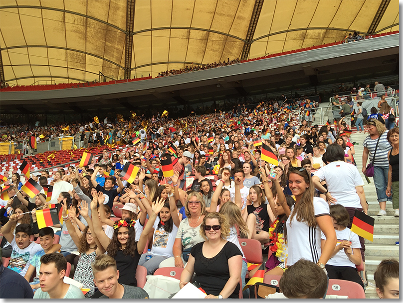 54000 Zuschauer sahen am heutigen Montag beim Eröffnungsspiel der U19-Europameisterschaft den Klassiker Deutschland gegen Italien. Auch die Park-Realschule hatte mit fast 300 SchülerInnen und LehrerInnen den Weg nach Bad Cannstatt angetreten um die Nachwuchsstars anzufeuern.